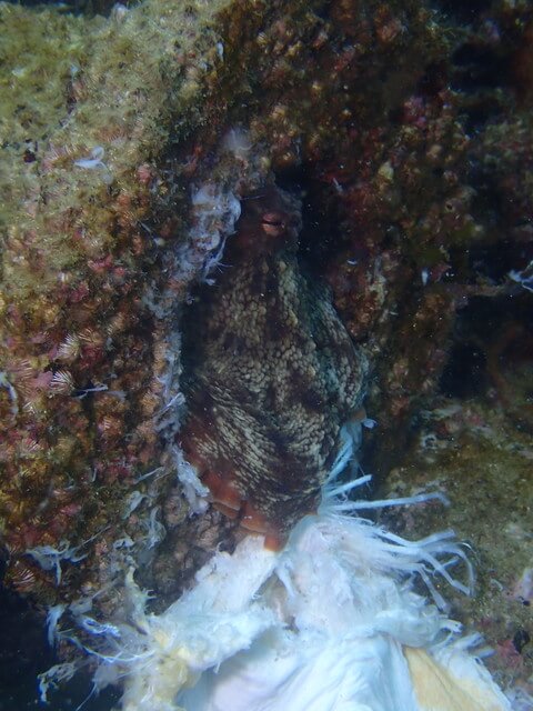 マダコが死んだアカエイを自分の住処にえいやえいやと引きずり込んでる場面にでくわしました。