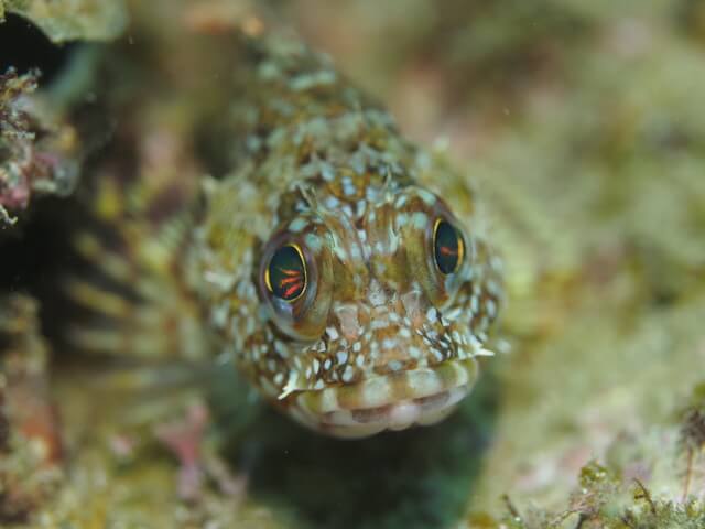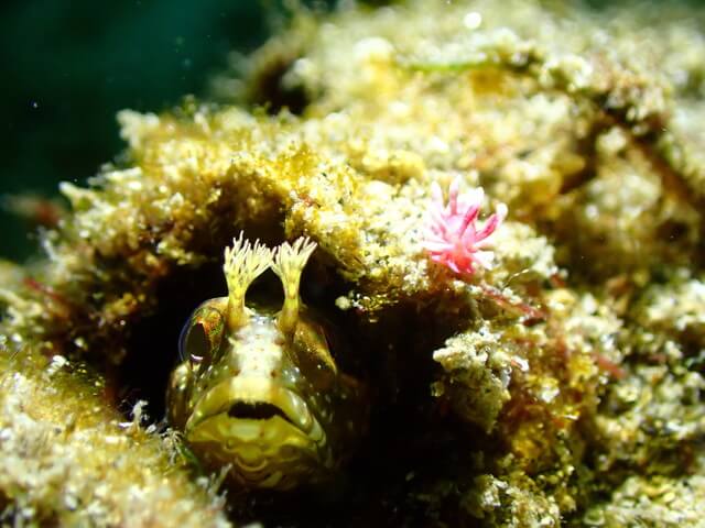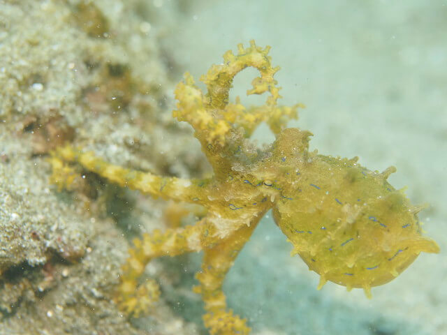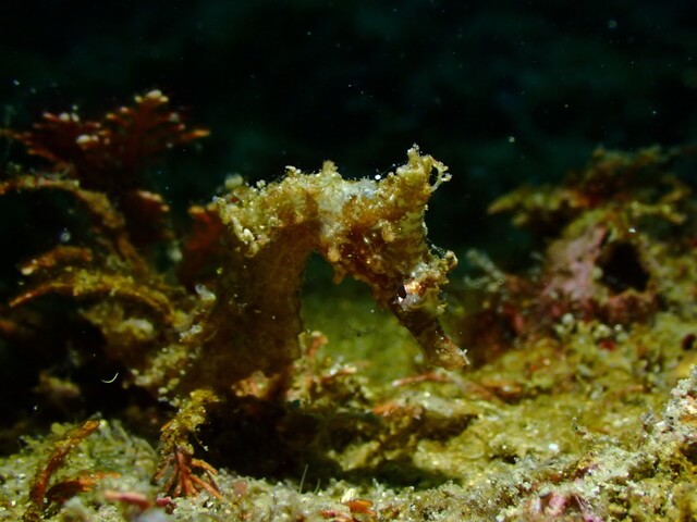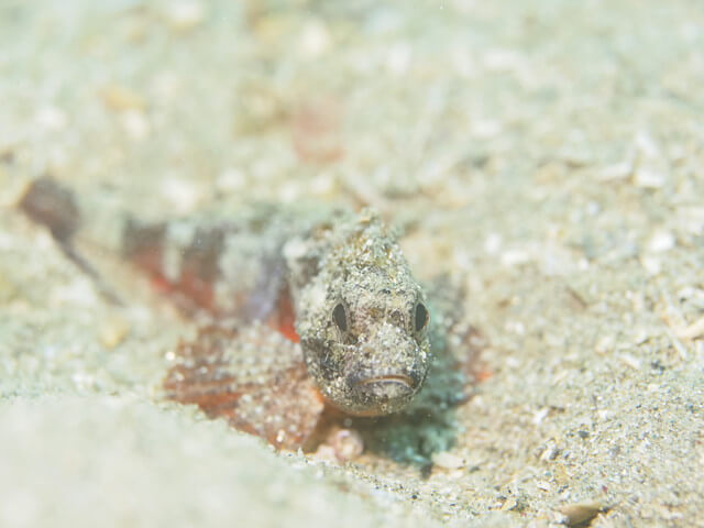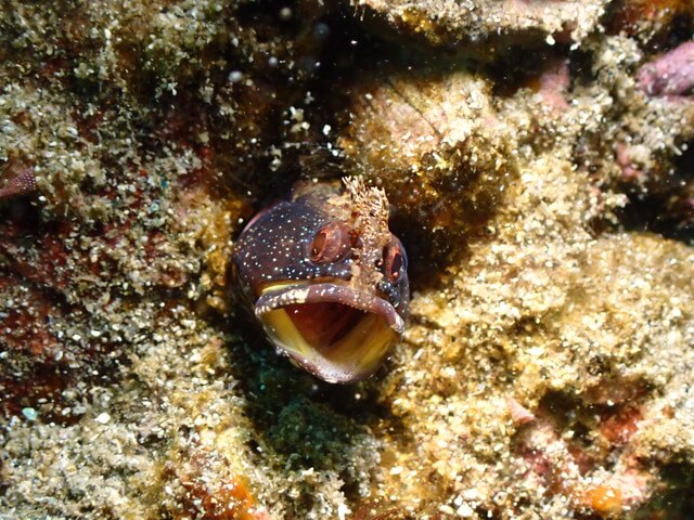 ここには、オニオコゼのチビや猛毒のヒョウモンダコ、大きなコケギンポに、いつものタツノオトシゴなどマクロ生物が多くてついつい長居。