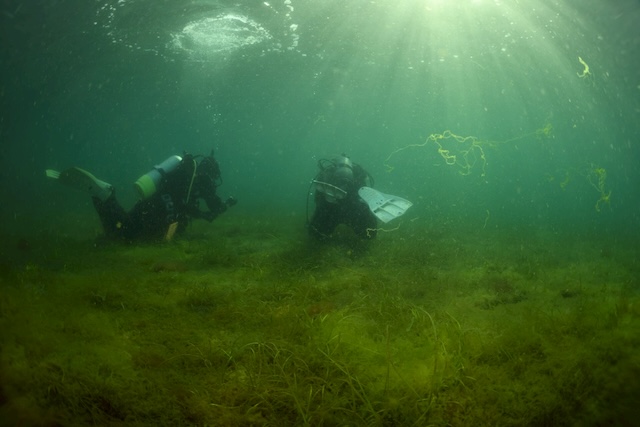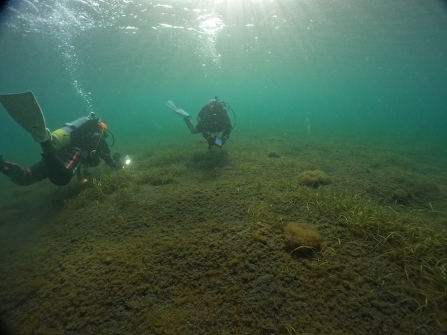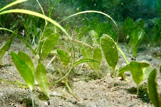 海藻の絨毯に日光が差し込む幻想的な雰囲気。