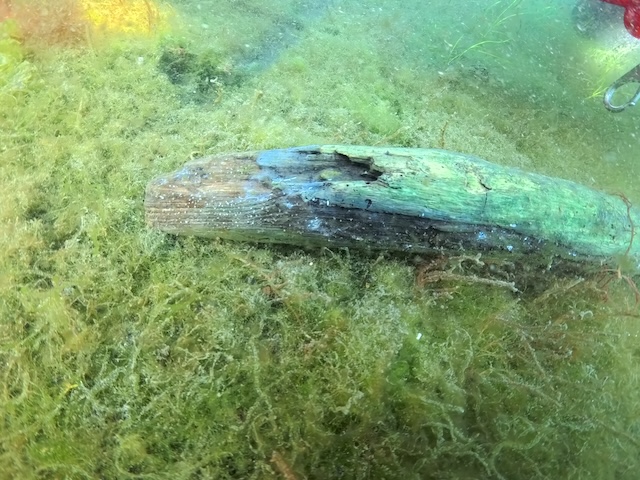 奥に行くと、古い流木が海藻の絨毯の上で横たわっていました。