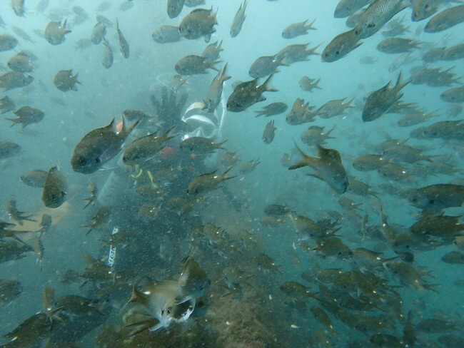 この撒き餌には警戒心の少ないスズメダイがすごい勢いで群がりました。