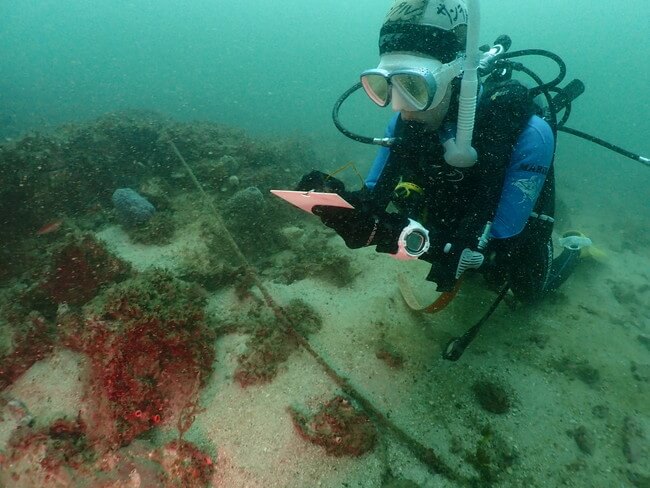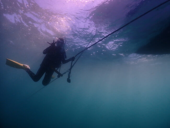 そう、透明度3mの水深20mはじめての玄界灘ボートダイブで泳ぎについていけなくなったミーちゃんとバディのラムを置いてね。