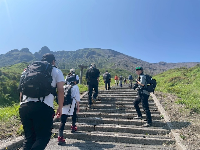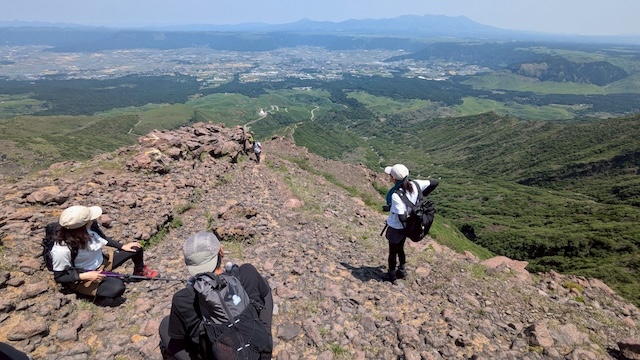 お昼ご飯を食べる前に、右手に見える阿蘇カルデラで最も高い山、高岳の頂上を目指しました。