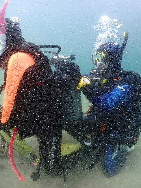 すぐに2人とも前回上手くできなかったシリンダーが外れた時の対処をあげたので、陸上で再度練習して水中で実践。