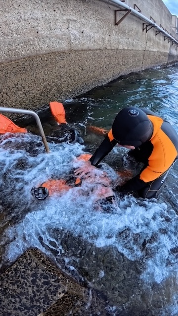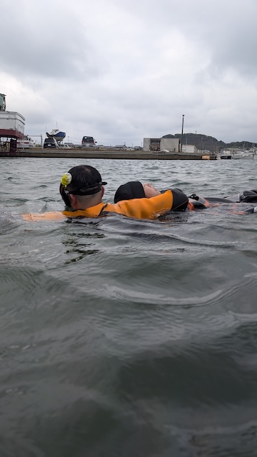 休憩なしで、水面で溺れている人を助ける訓練開始。