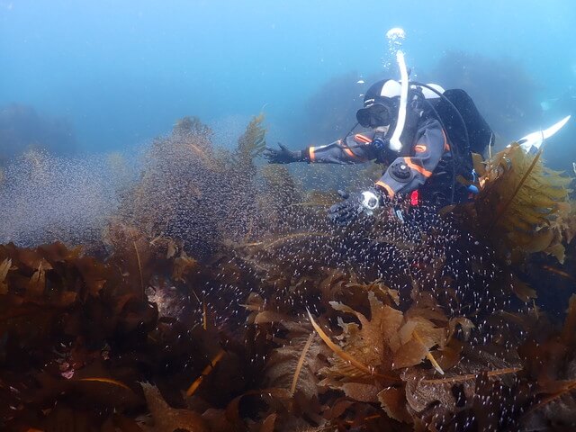 数が多いので、食事中の個体、繁殖中の個体、産卵中の個体なども簡単に見ることができて冷たい海でも熱くなります。
