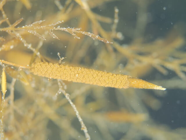 これから雄の生殖器床から放出された精子が受精することで、幼胚とよばれるアカモクの赤ちゃんの誕生というわけです。